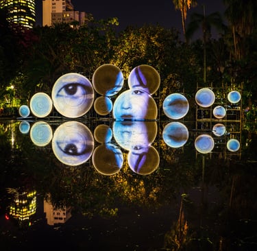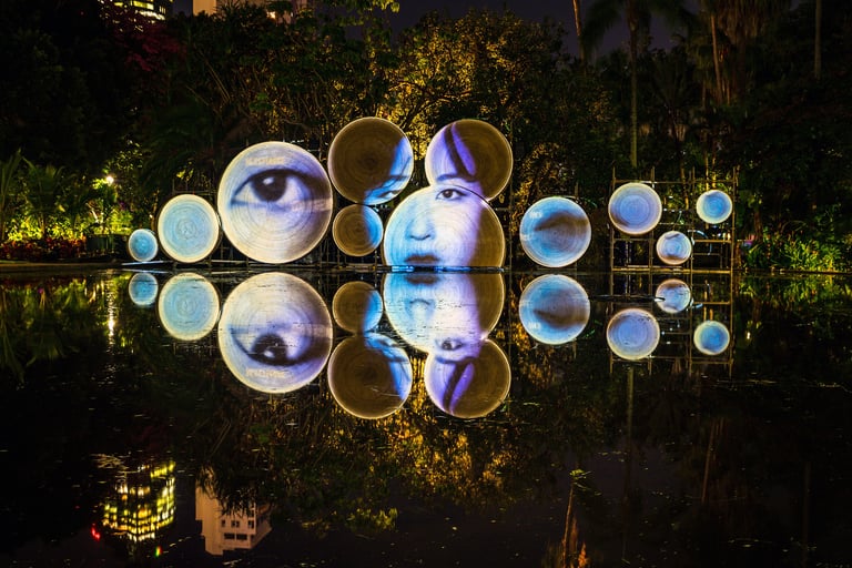 RIPPLE (Botanica, Brisbane City Council) is a projection-mapped, floating screen sculpture that uses water as a metaphor for the fluid complexity of human emotion. Drawing on Jung’s philosophy, audiences move through water states; ice, liquid, vapour, as inner states: fear to acceptance, repression to release.